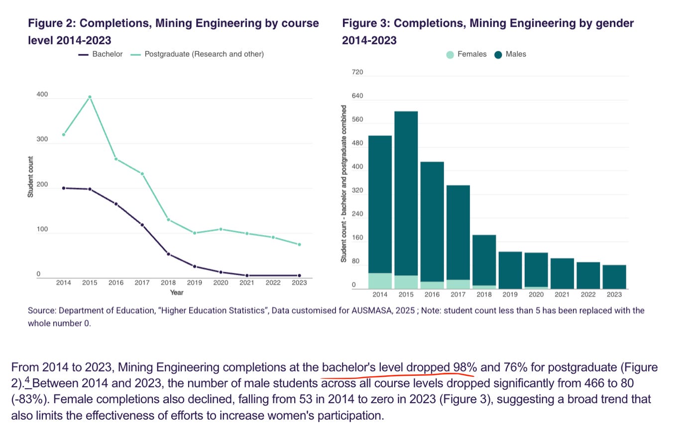 The United States has lost nearly half its mining engineering enrollment — from 1,561 students in 2015 to approximately 600 by 2022. Twelve mining engineering programs have closed since 1985, reducing the total from 25 to 14. The remaining schools collectively graduate fewer than 200 mining engineers annually, whereas an estimated 400+ are needed.