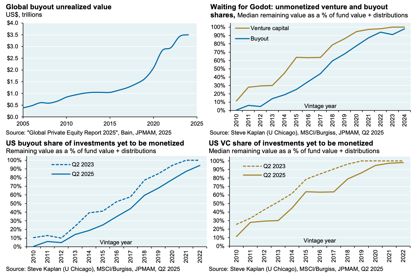 If you don’t have time to read it (it’s 56 pages), these charts tell the story (there is a lot of “trapped” paper/fantasy gains in PE and VC).