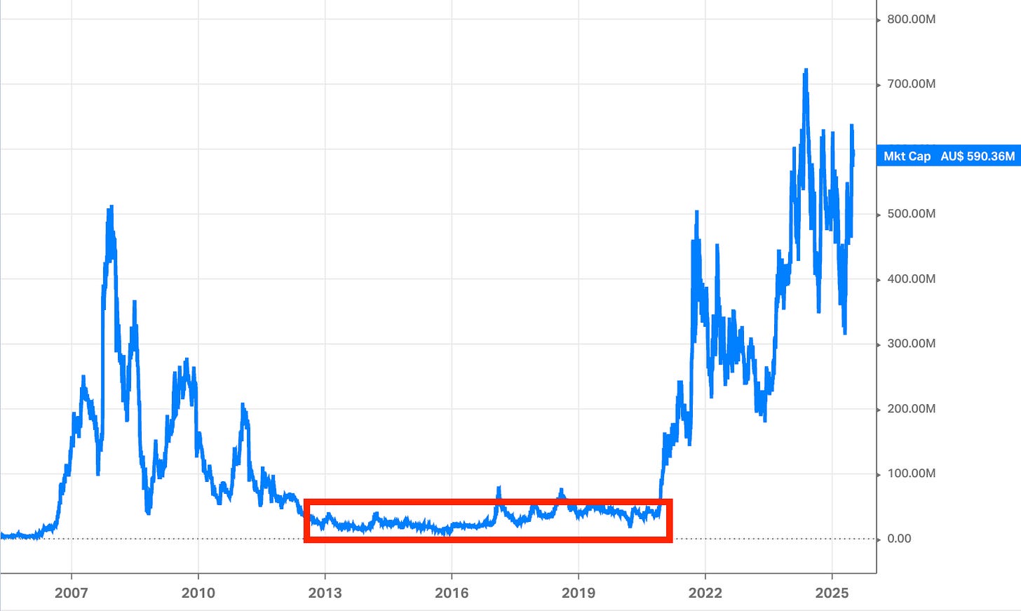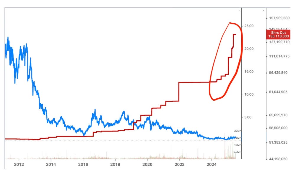 The majority of long-term junior mining charts appear great until you realise they are actually call options, and the "time decay" being the rate at which they are printing shares.