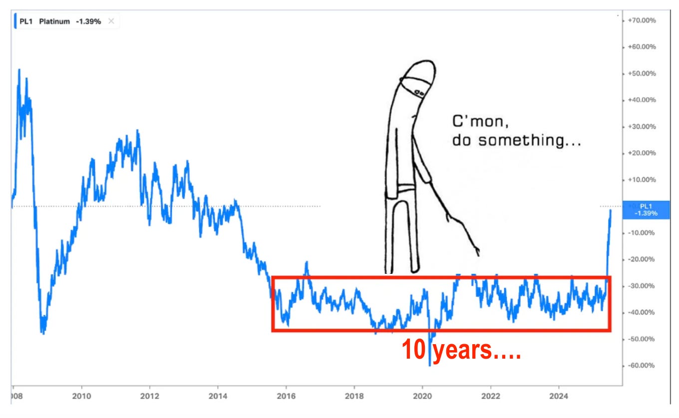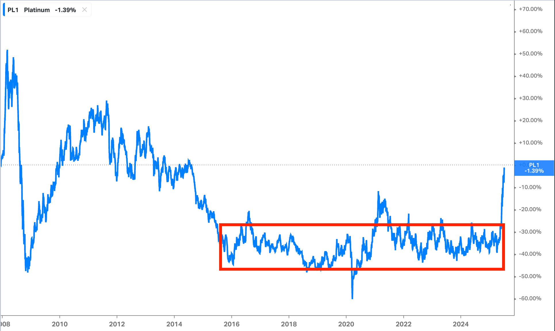 Take platinum, where very few fund managers would still have their jobs holding platinum, as it did nothing for a decade while US tech shot the lights out.