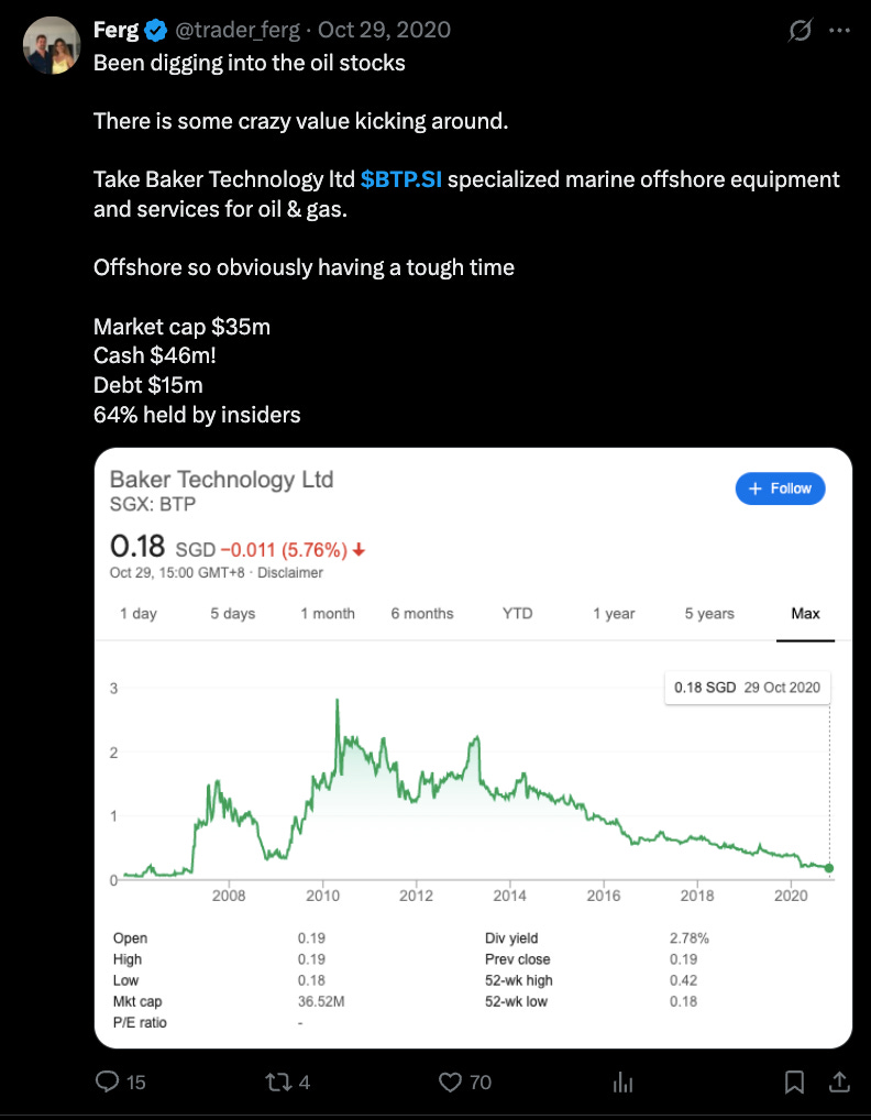 A margin of safety can simply be cash; here is a tweet from October 2020, where I didn't have a strong view on the company but figured it was hard to screw it up, given the company's majority cash position and its underlying offshore equipment business, which is quite cyclical.