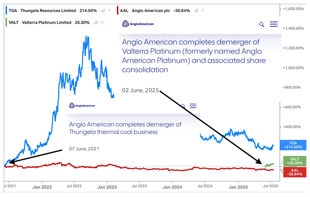 There is a long history of companies being spun out from their parents, going on to outperform them substantially, especially when the spinout is not based on economic considerations, i.e. Net Zero ideology. We have seen this repeatedly over the last few years with mining majors spinning out their "dirty" assets to focus on "transition" metals. To date we have seen and I expect to continue to see massive outperformance by the assets that are spun out.