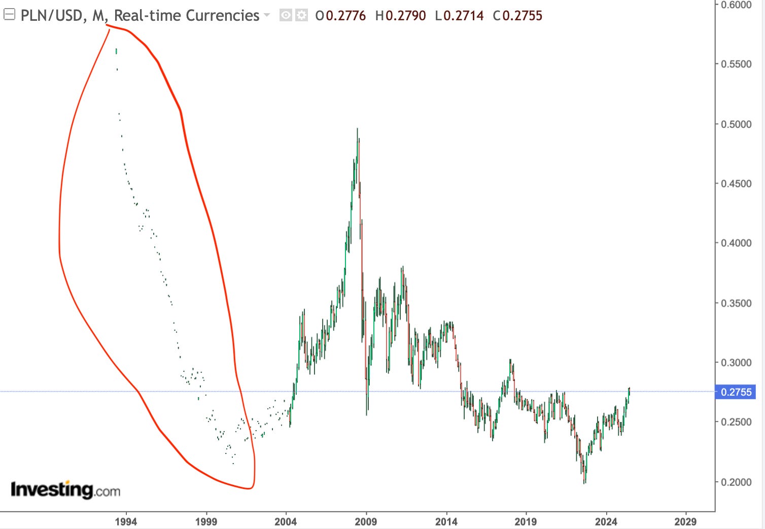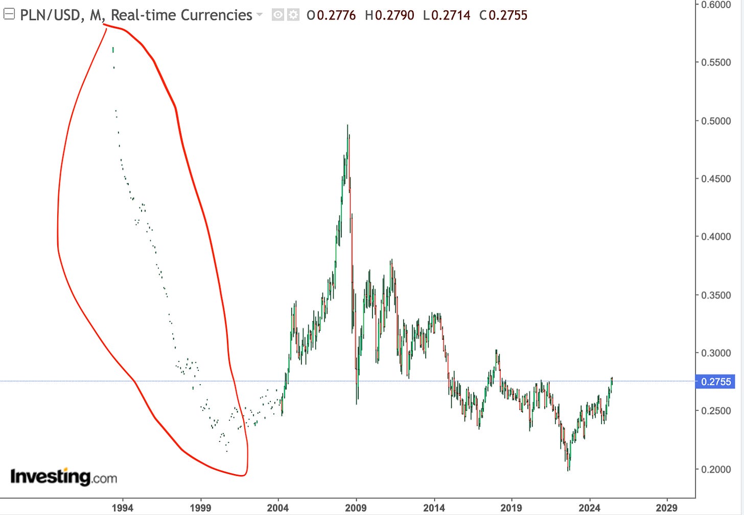 The Warsaw exchange is the crazier one, as you could have taken home that return, since the USD/PLN was ~3.3 in the mid-1990s and ~3.65 in mid‑2025, so only 10% depreciation reduces returns from 107× to ~97× in USD.