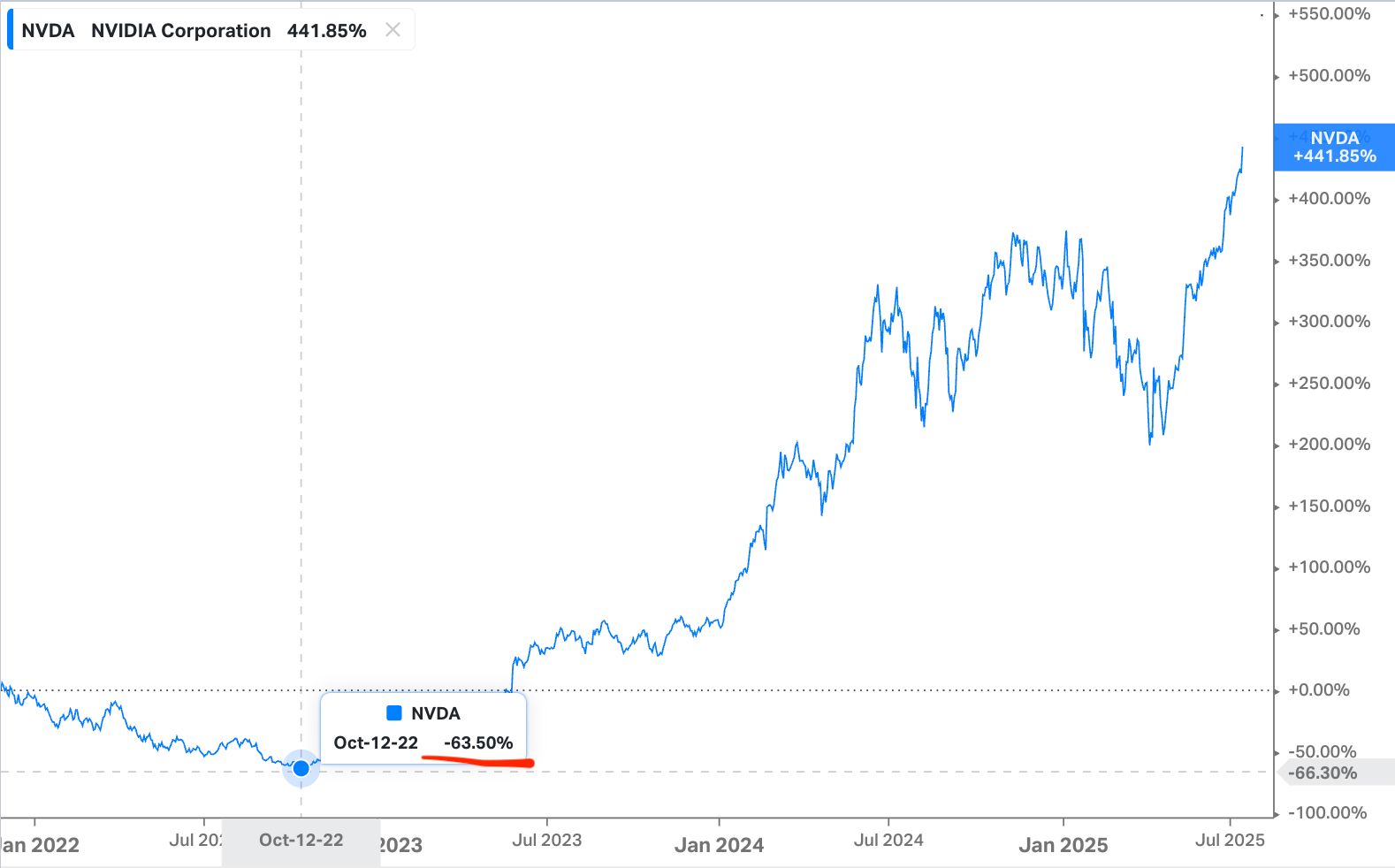 It's all so obvious with hindsight bias, but consider someone who bought Nvidia early in 2022 was staring at a ~60% drawdown by October.
