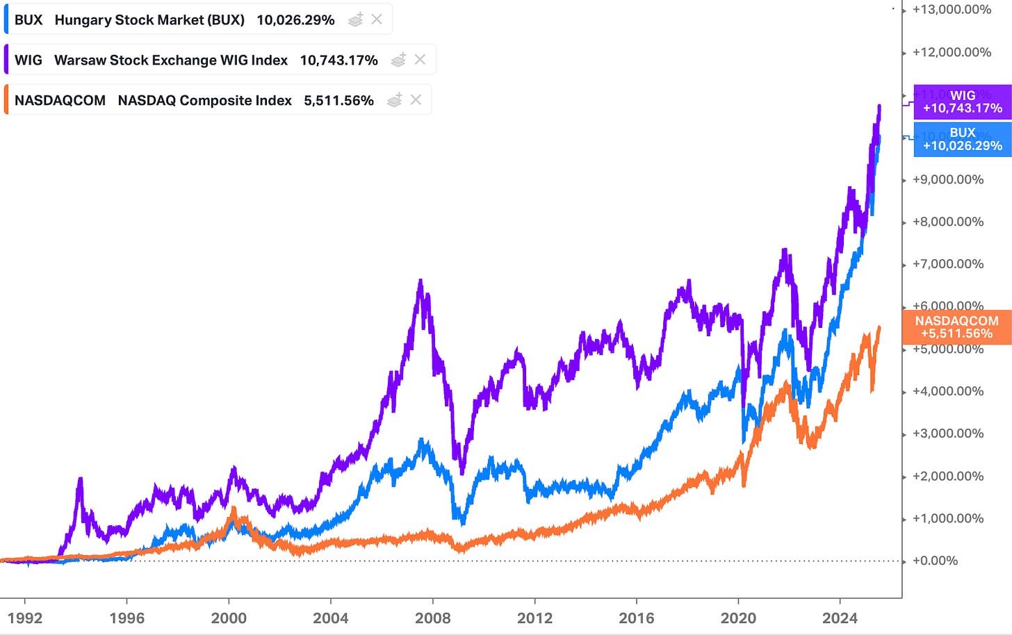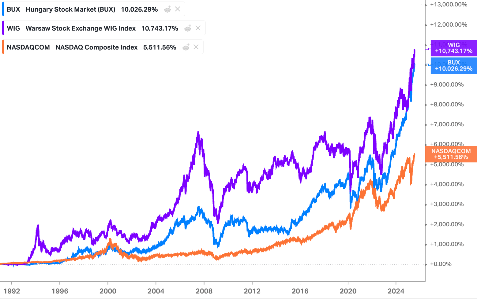 With the Hungarian BUX adjusting for currency depreciation (USD/HUF averaged ~150 in 1992; by 2025 it's 340), so the 100× HUF gains translate to ~50× in USD. You also had to put the index together yourself up until 2006 when the first BUX etf was created.