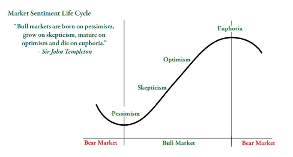 Knowing where we are regarding sentiment is more art than science. My metric for measuring sentiment has always been Sir John Templeton's maxim.