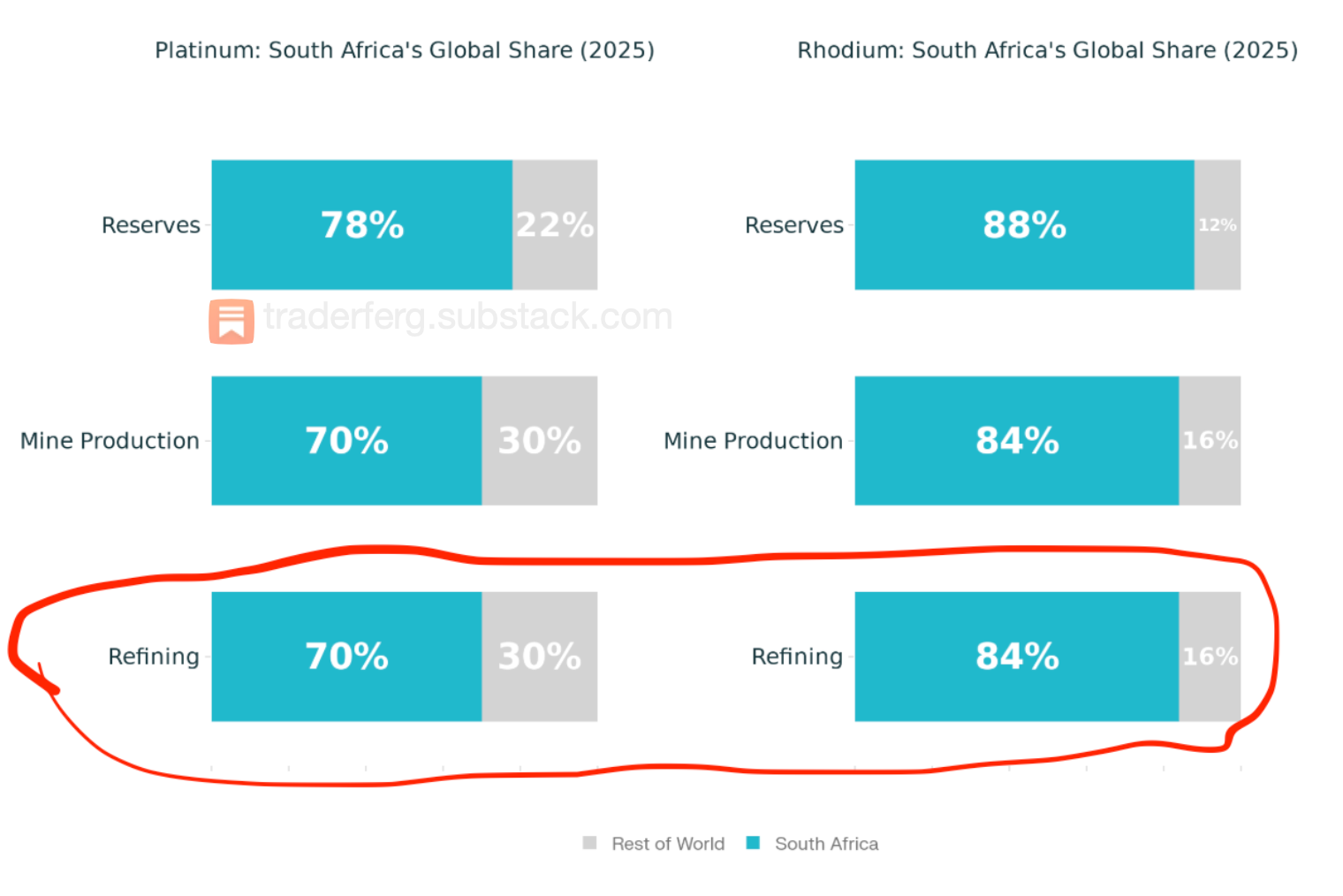 Between South Africa and Zimbabwe, you are looking at 81% of global platinum refining (84% for rhodium).