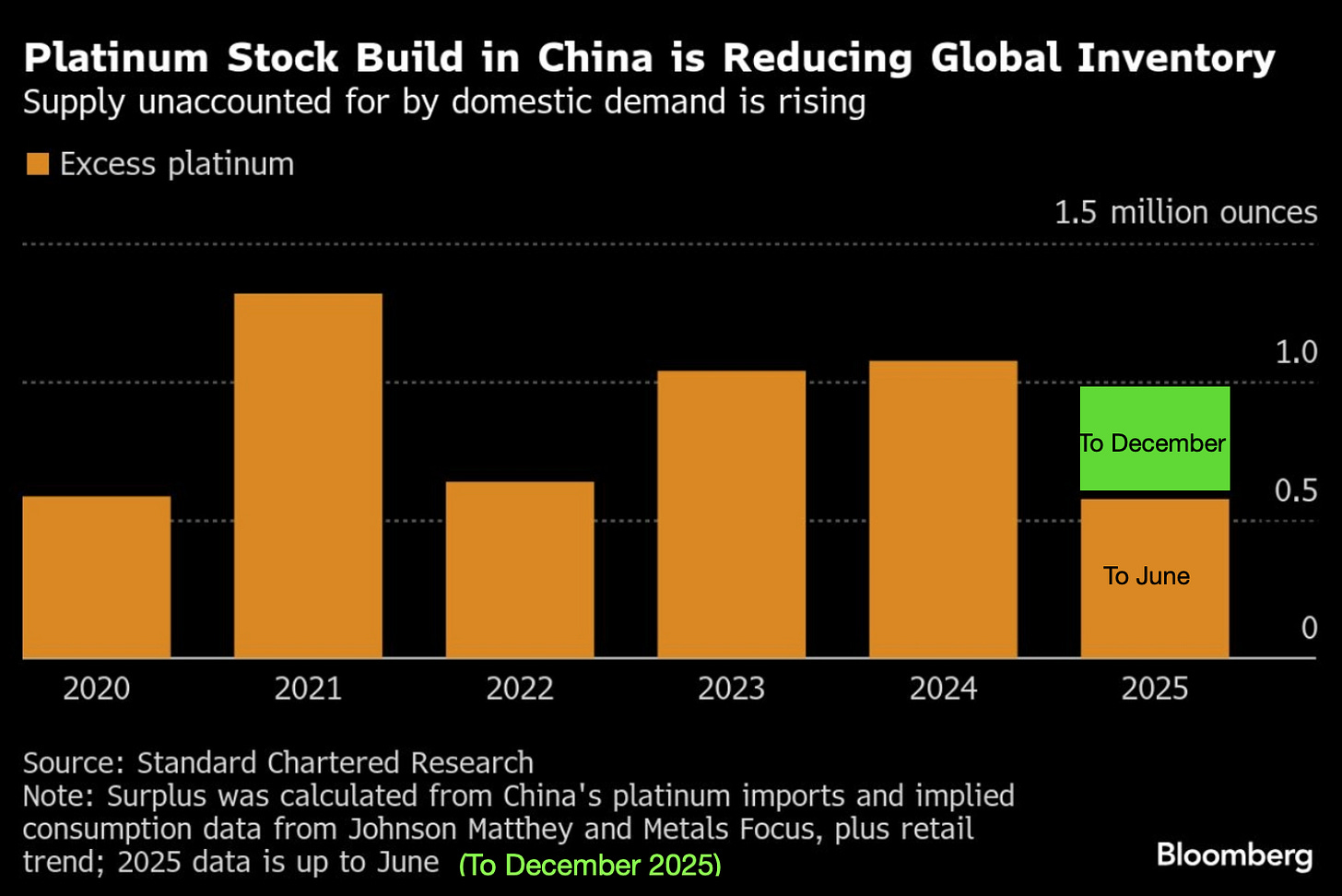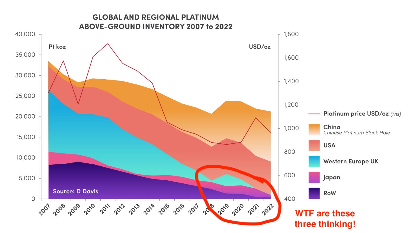 Tracking Chinese platinum imports in excess of demand has them stacking a further ~3million ounces on top of Dr Davis’ ~12 million ounce estimate in 2022. This brings their holdings to ~15moz (~83% global AGI) against WPIC-tracked platinum AGI, which stands at 2.978 moz (~17% global AGI) total above-ground inventory tracked by the WPIC, which includes all vaulted platinum holdings globally—excluding ETFs, exchange stocks (like CME), and working inventories of producers/fabricators/end-users.