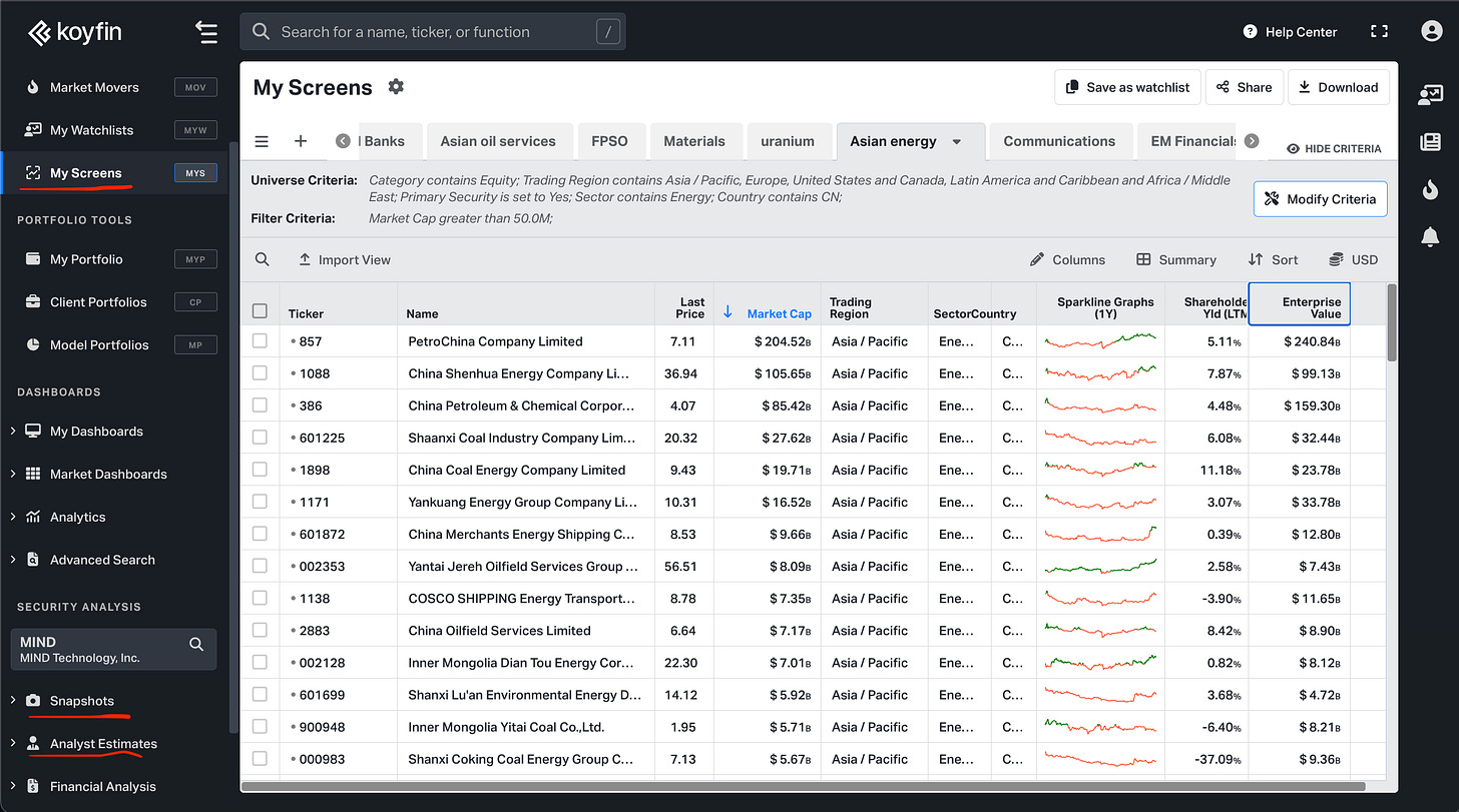 Once you’ve narrowed your search to a handful of names, the Snapshot function is awesome for quickly assessing if the company is worth researching further.